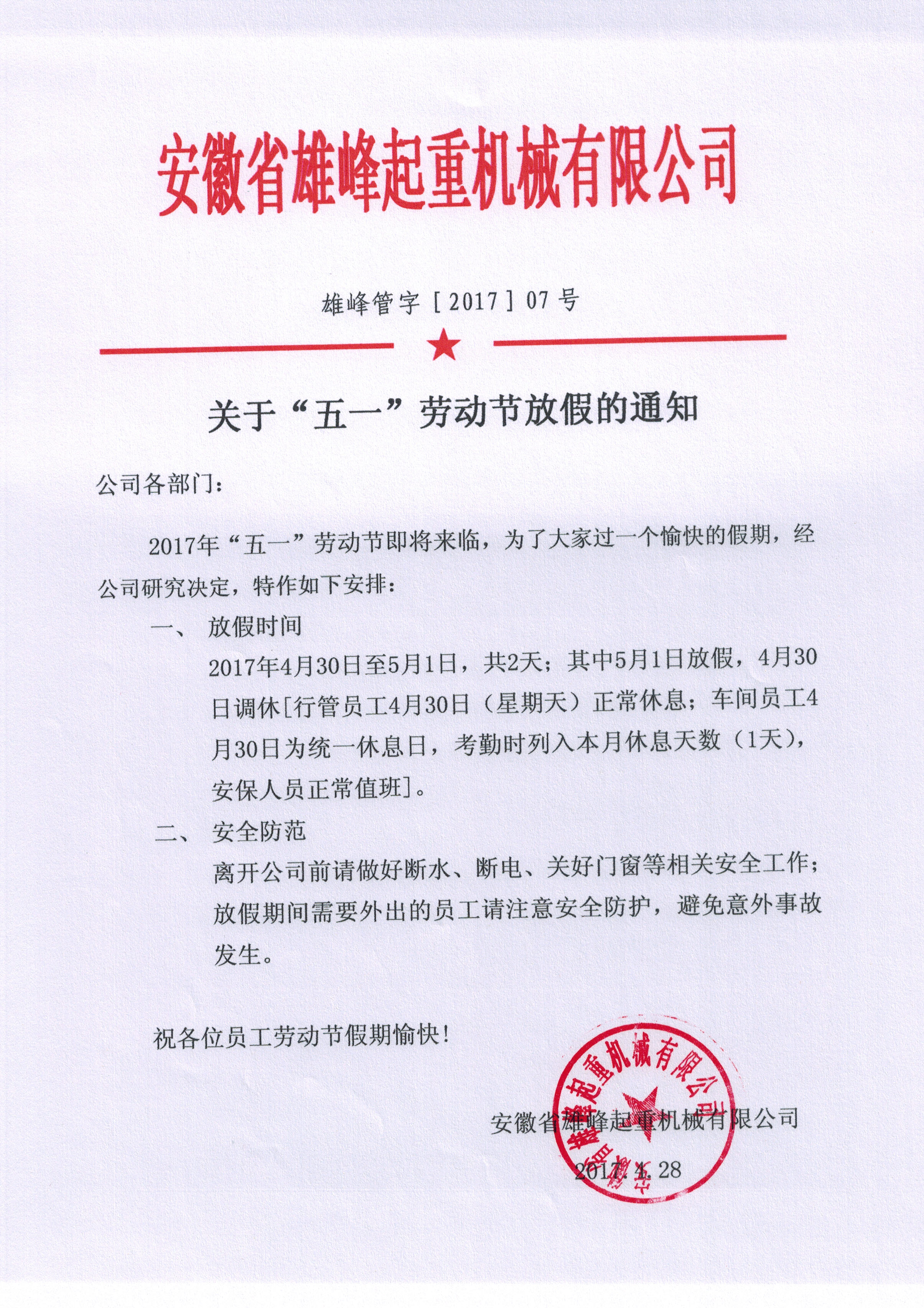 2017年“五一”勞動(dòng)節(jié)即將來(lái)臨,為了大家過(guò)一個(gè)愉快的假期,經(jīng)公司研究決定,特作如下安排: