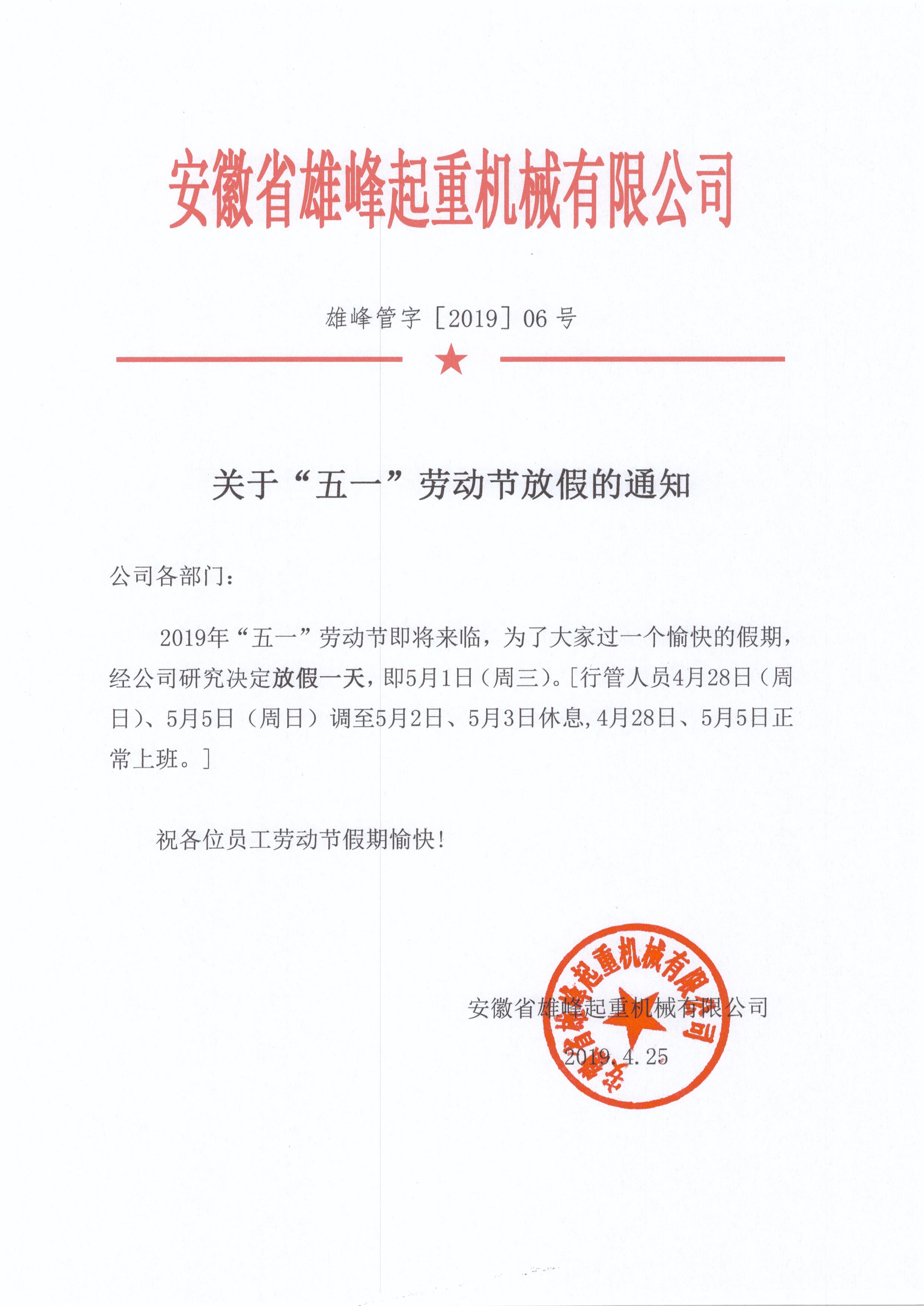 2019年“五一”勞動(dòng)節(jié)即將來(lái)臨,為了大家過(guò)一個(gè)愉快的假期,經(jīng)公司研究決定放假一天,即5月1日(周三)。[行管人員4月28日(周日)、5月5日(周日)調(diào)至5月2日、5月3日休息,4月28日、5月5日正常上班。]